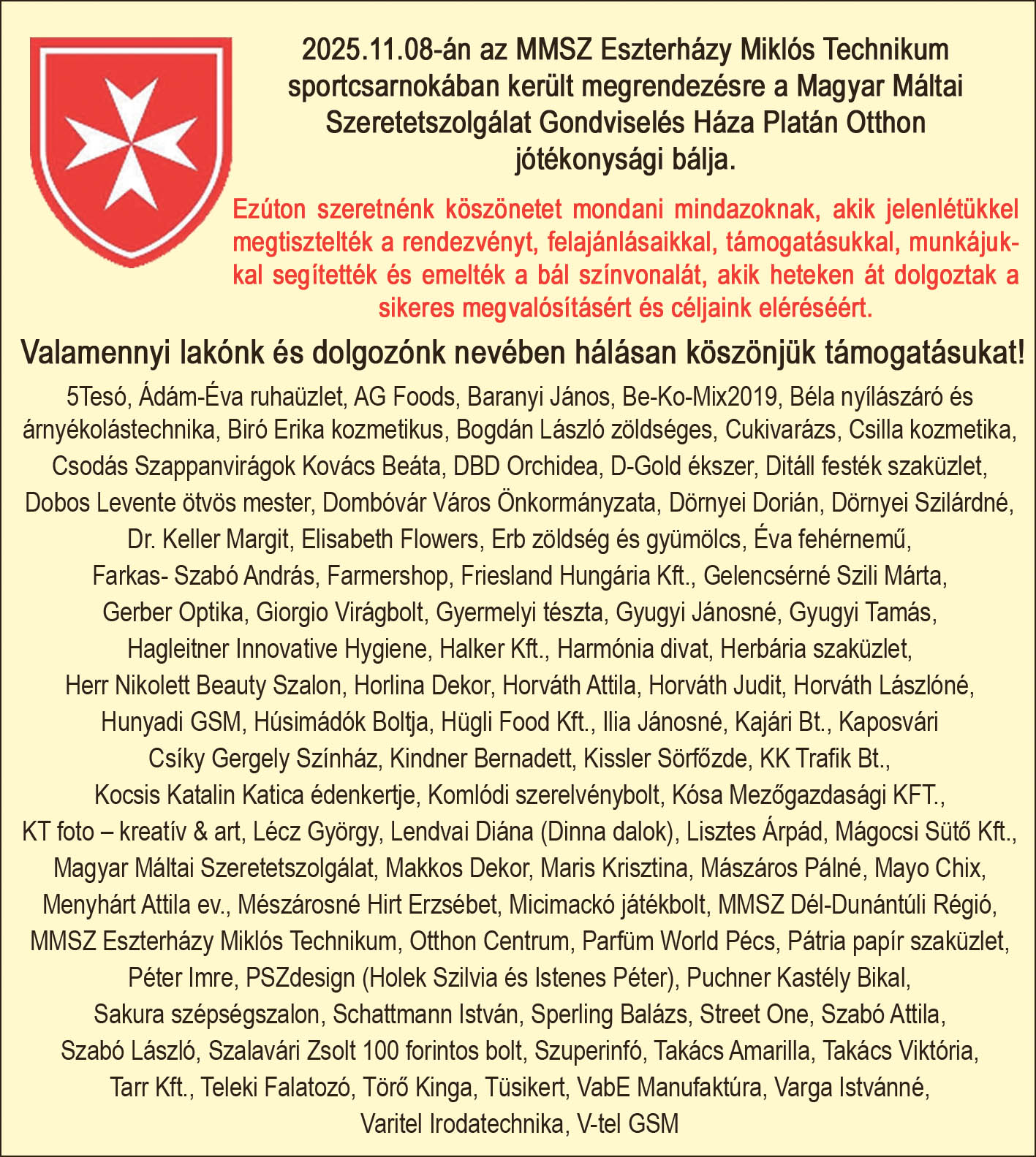 2025. november 8-án az MMSZ Esterházy Miklós Technikum sportcsarnoka adott otthont a Magyar Máltai Szeretetszolgálat Gondviselés Háza Platán Otthon jótékonysági báljának.