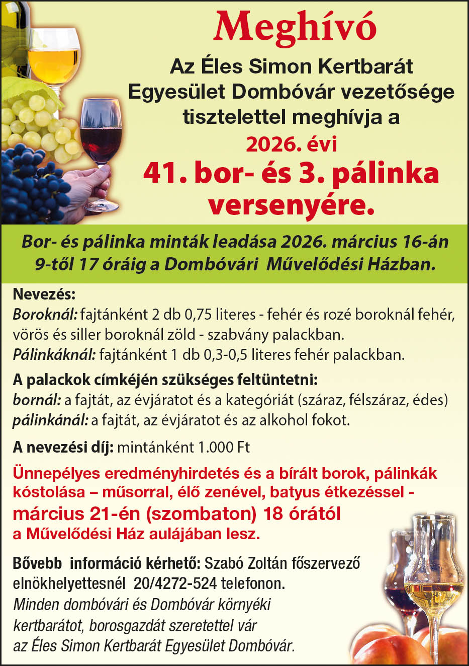 Az Éles Simon Kertbarát Egyesület Dombóvár 2026. évi bor- és pálinka versenye