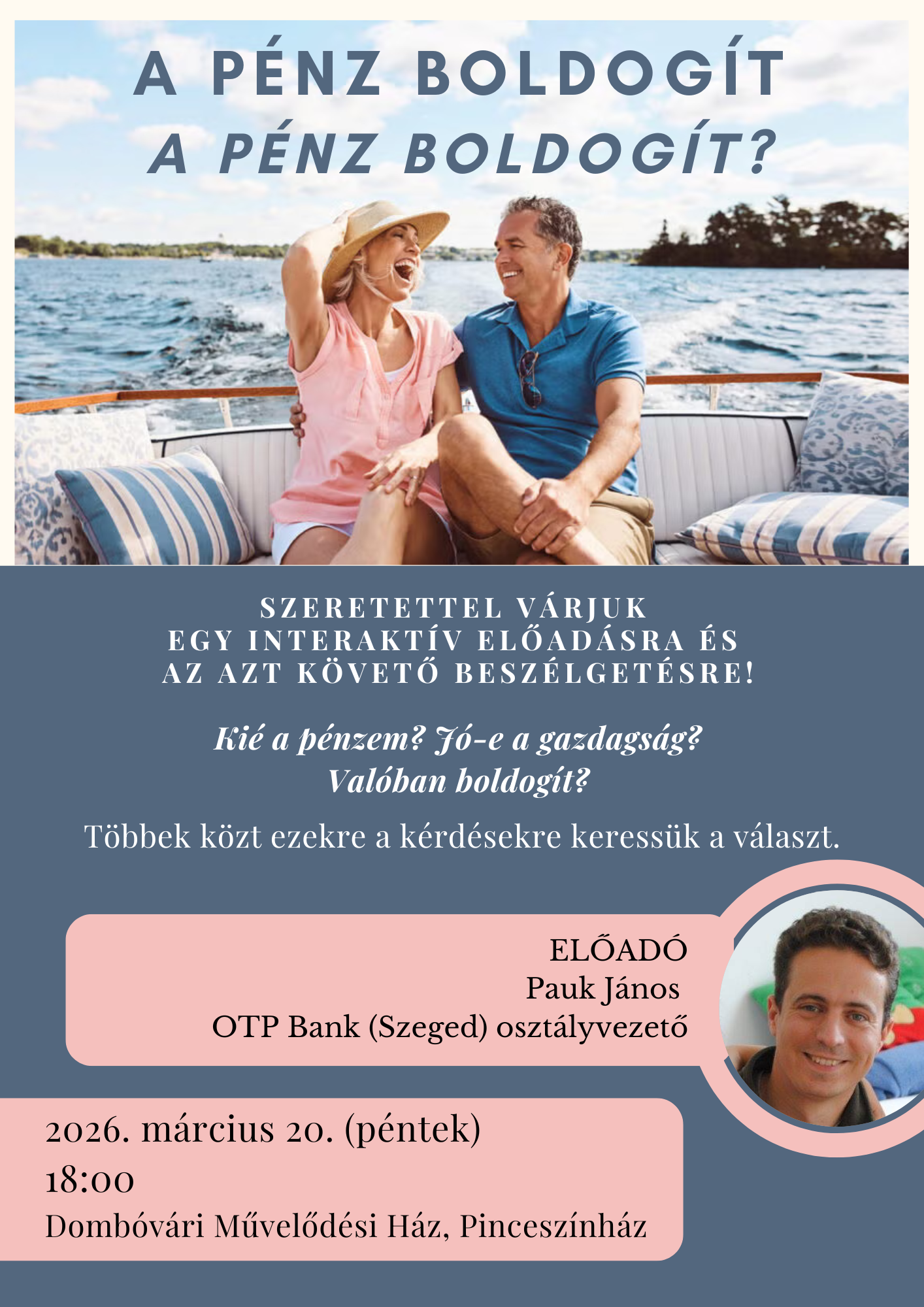 Valóban boldogít a pénz? Keressük a választ március 20-án 18 órakor a Dombóvári Művelődési Ház pinceszínházában!