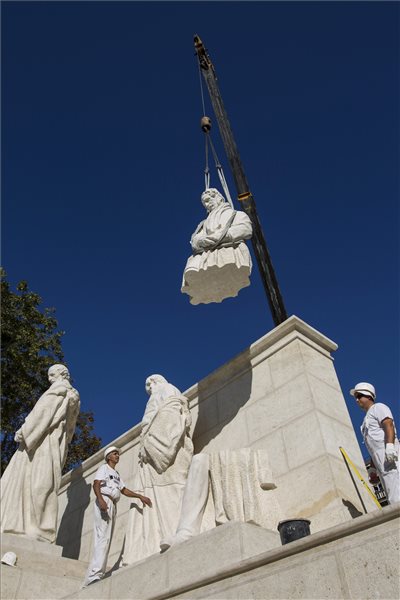 A Kossuth-szoborcsoport egyik alakját, a Szemere Bertalant ábrázoló szobrot helyezik el Budapesten, a Parlament előtt 2014. október 14-én.