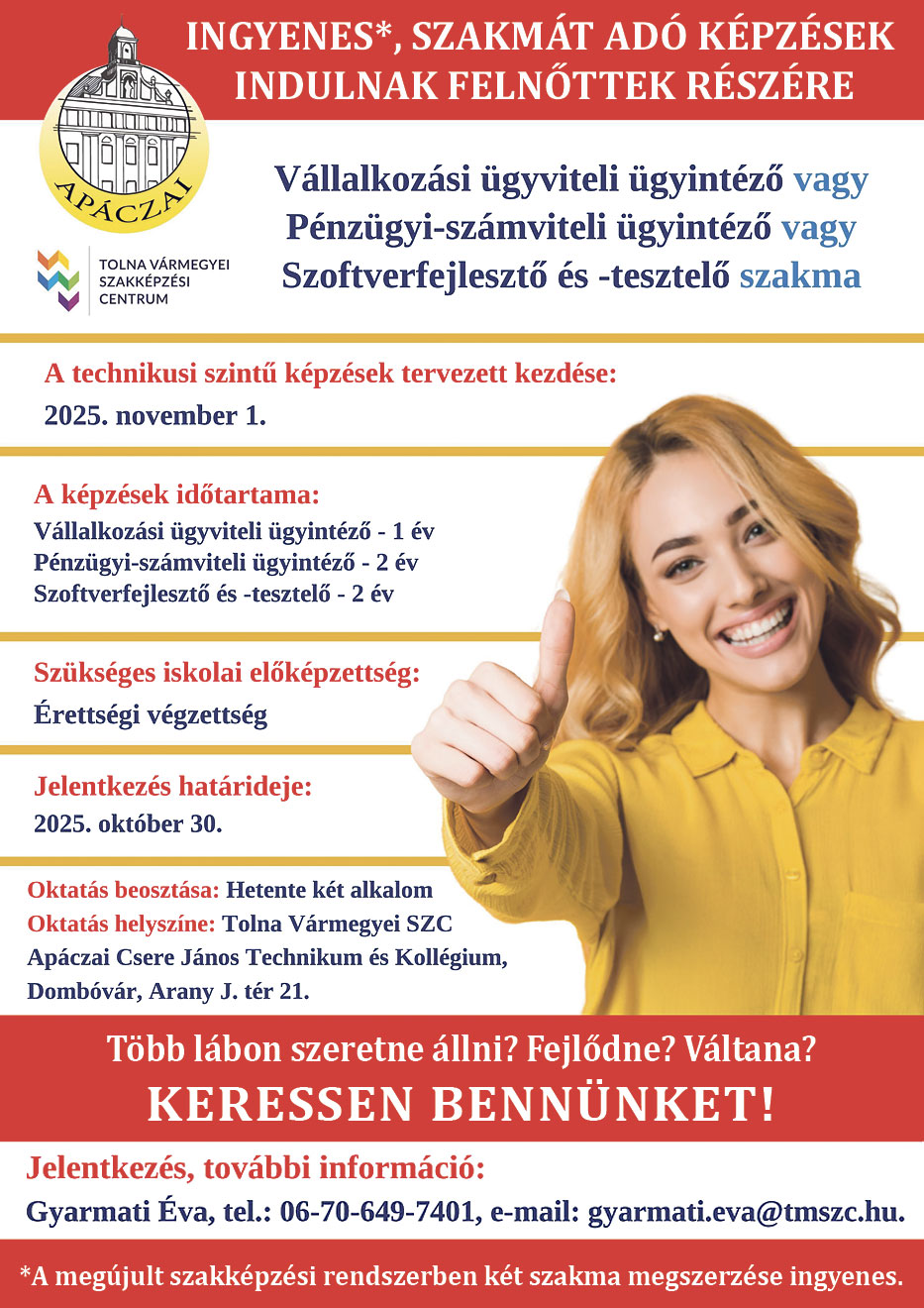 Az alábbi munka mellett elvégezhető képzések indulnak felnőttek részére a Tolna Vármegyei SZC Apáczai Csere János Technikum és Kollégium szervezésében.