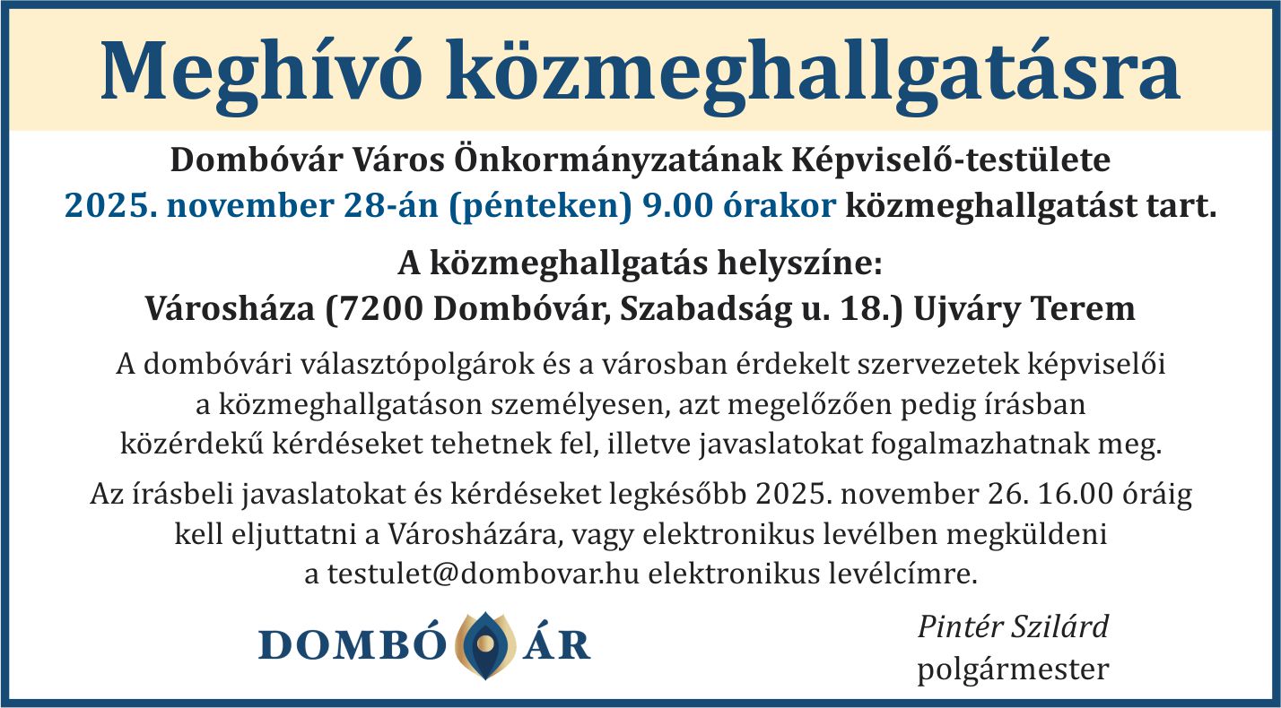 Dombóvár Város Önkormányzatának Képviselő-testülete 2025. november 28-án 9 órakor közmeghallgatást tart.